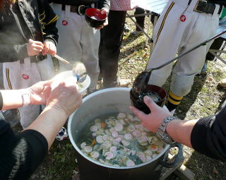 新木小に12時集合、ファイターズ球場に集まりまずは新年の挨拶。 お母さん方も並びます。 ファイターズの鍋や釜などの調理道具です。 お母さん方が作ってくれたきなこ餅です。 おいしそうな磯辺焼きです。つきたてのお餅はやわらかくてとてもおいしいです。 まずはちびっ子から並んできなこ餅や磯辺焼きをもらいます。 お餅を食べるちびっ子2年生。 ![]()