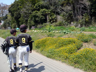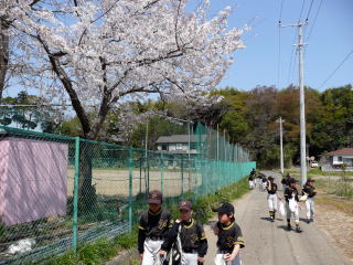スポーツ少年団の開会式に向けて、新木小に朝8時半に集合し、ファイターズ球場に車で向かい、ファイターズ球場から徒歩で、開会式の会場の市民体育館に向かいます。 ファイターズ球場の桜が満開でとてもきれいでした。ファイターズ球場からこのスポ少開会式が行なわれる我孫子市民体育館までの往復のお散歩はファイターズの毎年恒例の行事です。 ファイターズ球場を出発してしばらくするとこのような広い田んぼが見えます。もうじきここに水が張られ、田植えが始まります。 ようやく市民体育館が近づいてきました。あの体育館でスポーツ少年団の開会式が行なわれます。体育館のほかには、テニスコートや野球場もあります(両方ともナイター照明あり)。 ここの野球場で、布佐ジャイアンツとのコーチ戦が行なわれました。 2008年度 我孫子市スポーツ少年団の開会式。観客席から数えたら、全部で33団体、うち野球チームは18チーム、サッカーは10チーム、その他は合気道やミニバスケでした。我孫子市はまだまだ野球がさかんでサッカーよりも野球チームの方が多かったです。 ファイターズの隣は、新木やまとSSと新木野コンドルでした。みな新木小では知った顔なので仲よさそうに話しをしていました。 スポ少開会式の後は、我孫子警察による安全講習会。春の全国交通安全週間ということで、安全な自転車の乗り方を教わりました。右から二人目は新木ファイターズキャプテン吉川かずき。 開会式は午前11時半頃で終了。市民体育館から出発。 ファイターズ球場に帰ります。 いかにも田舎の渋い民家。 黄色いきれいな菜の花が咲いていました。 いかにも田舎という雰囲気満点の民家と桜の木の前を通るファイターズの子供たち。 オレンジ色のきれいな花が咲いていました。 ファイターズ球場に帰ってきました。それにしても見事な桜です。天気もよくて、市民体育館への往復は本当にいいお散歩でした。 スポーツ少年団の開会式から帰ったらお弁当を食べる子供たち。 お弁当を食べる子供たち。なかなかいい場所を見つけるものです。 バックネット裏にあるファイターズ球場の桜。桜の木の元にあるのは新木ファイターズの倉庫です。 遊ぶ子供たち。左から、ひさむね(2年)、ようへい(4年)、しょうた(4年)。 野球のミニゲームをする子供たちを見る監督、コーチたち。桜の花びらが舞い、風も心地よく、少年野球とは、まさに最高のアウトドアです。こうしてファイターズ球場にいると、わざわざ遠くにお金をかけて出かける必要は無いと思うくらいです。 満開の桜の木の下で練習に励む新木ファイターズ。2008年度もがんばろう。