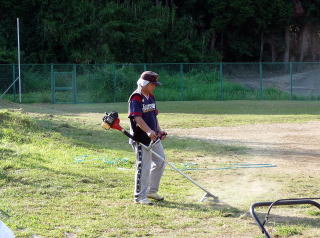草刈りが終わり、昼間超暑い中で草刈りをしたせいか、夕方風が涼しく心地よく感じ、草が刈れてきれいになったファイターズ球場を見て、今回参加のスタッフは皆満足気でした。それにしてもファイターズ球場って、周りが緑で囲まれて、手作り感あふれ、とてもよく出来た練習場だと思います。心地よい風に吹かれながら、周りの鮮やかな緑を見ながら雑談しているととても幸せに感じます。遠くに出かけなくてもこれも立派なアウトドアと思います。こんな練習場で練習している子供たちは幸せと思います。でもちょっと欲を言えば、もう少し外野が広くて、外野が芝生で、両軍の屋根つきのベンチがあって、あと今はメイングランドが一面しかないのであともう一面グランドがあれば言うこと無いのですが・・・(欲を言えばきりがありませんが(^^ゞ)