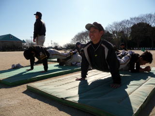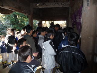 2010年1月9日土曜日、新年のファイターズ始動日です。まずは新木小でグランド開きです。たく、かんの、小池なおきが各塁とマウンドを回ります。たくがピッチャープレートをお酒で清めます。 ベースとプレートを塩とお米とお酒で清めたらみんなで二拝二拍二礼です。 新木小のグランド開きが終わったら今度は近くの神社に初詣でに出かけます。このような素朴な風景が広がっています。天気もいいです。私はファイターズの活動を通して見る新木の風景が大好きです。北は北海道、北東北等など、南は四国や石垣島など全国色々旅しましたがやはり自分が住んでる新木が一番です。 社をくぐり神社に向かいます。 みんなで二拝二拍二礼です。 神社で初詣でが終わったら新木小に戻ります。 初詣でが終わったらスポーツテストです。立ち幅飛びをする岩くん。 立ち幅跳びは岩くんが196cmで最高記録でした。岩くんは市内陸上大会の走り幅跳びでも優勝していて、この足腰の強さとバネが、打球を遠くへ飛ばす天性と結びついているのでしょう。 打球を遠くへ飛ばす天性は誰もが持っているものではありません。目指せホームランバッター。 時間往復走をする岩くん、たいご、たく。 腕立て伏せをするそうま。 上体起こし(腹筋)をする だいすけ。 最後に5分間走です。1位はだいすけで1250mでした。だいすけは5分間走を2回も走り、2回目のほうが距離を走りました。 5分間走をする柴田コーチ。1060mでした。不肖私も走り1050mでした。年を追うごとに距離が減っています。徹コーチが1260mでした。 5分間走をする蒲生竜人(がもうたつひと)くん(3年生)。全種目参加でした。ファイターズに入団してくれるかな? スポーツテストが終わったら今度はファイターズ球場のグランド開きです。マウンドをお酒で清めるたく。 ファイターズ球場でも二拝二拍二礼でグランド開きです。 ファイターズ球場グランド開きが終わったら待ちに待った餅つき大会です。 おいしいお餅を食べる6年生たち。 おいしいお餅を食べる6年生たちその2。 雑草のなくなったサブグランドでお餅を食べます。つき立てのお餅はとてもおいしいね。 お餅を食べる4年生、みきひろ、りょう、きょうすけ。 行列のできるお雑煮屋さん。この子たちはお雑煮ができるだいぶ前からこのように並んで長いこと待っていました。