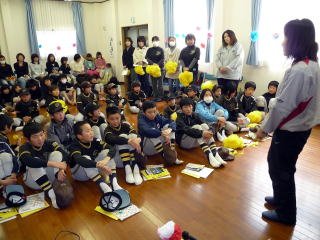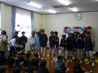 3月26日土曜、新木野団地内にある新木自治会館にて卒団式が行なわれました。午前中しか取れなかったため、9時から12時までの間に卒団式と定期総会をしなくてはなりませんでした。 写真ははじめの言葉を言う5年生たち。 |