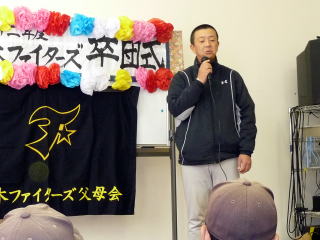 卒団生のしょうた、ゆうたのお父さん、金子コーチから挨拶。立派な挨拶で、涙ぐんでおられました。卒団式はいいものです。 |