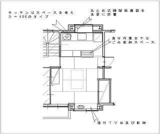 和室からキッチン方向を見ています。(まだ畳を張る前の写真です)和室とキッチンの仕切り部分は、天井と同じ米松合板で仕上げ、半分は造付カウンターで仕切っています。カウンターの下はキッチン方向からゴミ収納に利用しています。 |