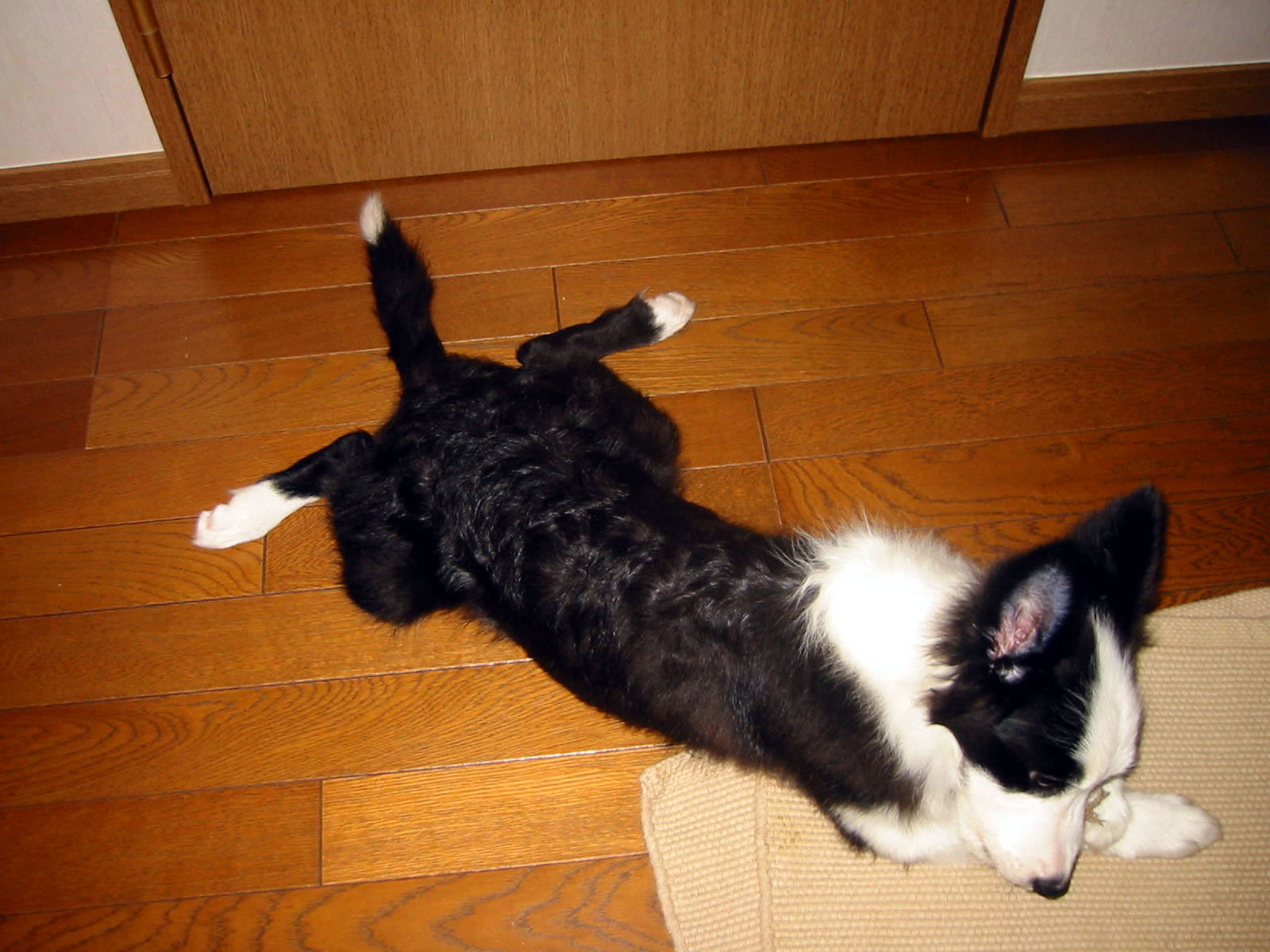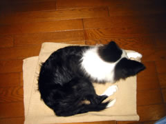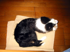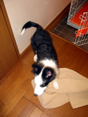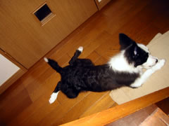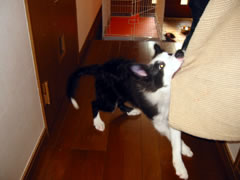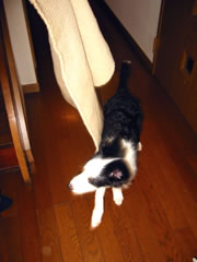 たいていおもちゃをしとめて走ってくると、マット(もしくはトイレの上で)このような体勢でおもちゃをはんでます。