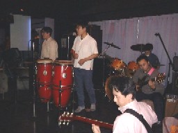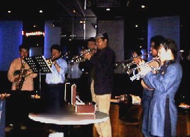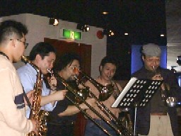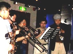 演奏も終盤に差し掛かり「ロリータ」と「トマトイッパツ」でラストにしようと話していたところに、突然のうれしいお客様が! なんと、ドンペイさんが参加している江古田勉強会の松岡さん(Tp)と忍田さん(Tb)がお仕事の合間をぬって遊びに来てくださったのです!まさか来て下さるとは思っていなかったのでビックリしてしまいましたが、とても感激でした!そして、一緒にこの2曲を演奏。特にホーン隊の方々が緊張しているのがすごく伝わってきましたが、とてもいい演奏で盛り上がりました。