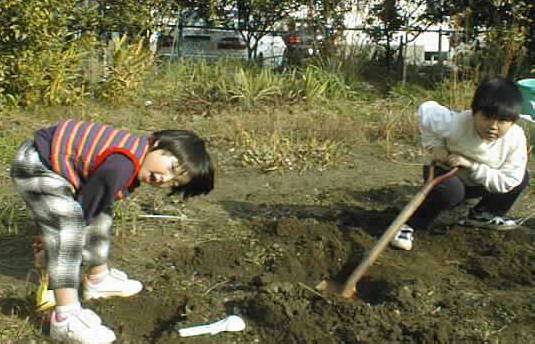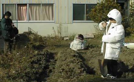ビオトープインデックスへ ’99-01-23 畑にあなをほりはじめました。 家族4人で日ごろなれないシャベルを持って、2時間かかりました。 筋肉痛まちがいなし!! ほる前の現地:はたけのうねの向こう側が現地です。 掘っています。 できあがり。1m×2m×0.5mくらいのサイズです。