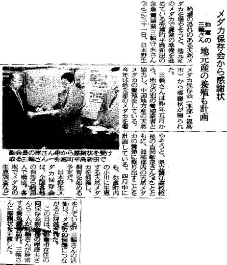 | 絶滅の恐れのある天然メダカを増やそうと、地元産のメダカで養殖の準備を進めている弥富町平島新田の金魚養殖業三輪守夫さん(六一)に三十一日、日本野生メダカ保存会(本部・福島市)から感謝状が贈られた。 三輪さんは昨年五月から、地元の別の養殖業者と協力し、中国地方産の天然メダカの養殖をしている。 今年は地元産のメダカを増やそうと、県立蟹江高校校長の吉岡敏彦さん(四六)とともに、海部郡内の天然メダカの養殖に乗り出すすことを計画している。四月中にも、弥富町内の小川に生息する天然メダカを捕獲獲し、飼育を始める予定だ。 日本野生メダカ保存会は、全国各地の有志ら約百人で構成。各地でメダカの生息調査などをしている。三輪さんの活動は、メタカの保護につながると評価された。 この日は、岩倉市在住の同保存会副会長の岸辰夫さんら二人が三輪さんが経営する養魚場を訪れ、三輪さんに感謝状を手渡した。 |