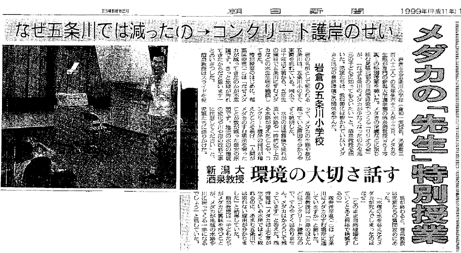 桜の名所として知られる五条川は、五条川小のすぐ東隣を流れている.同小では十年ほど前から、五年生の理科で五条川にすむメダカなどの水生生物を観察してきた. 特別授業のはじめに、****君(十一)は「なぜメダカが減ってきたのかが不思議です.きっと地球が汚れてきたからだと思います」とあいさつした.