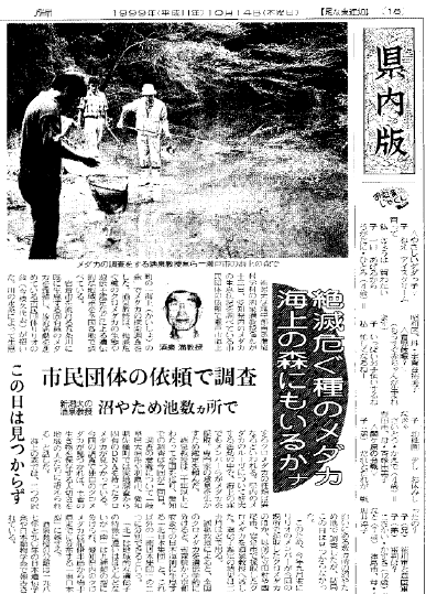 | 新潟大学理学部自然環境科学科の酒泉満教授(45)が十二日、愛知県内のメダカの生息状況を調べている市民団体の依頼で瀬戸市海上町の「海上(かいしよ)の森」でメダカの探索調査をした.酒泉教授は、絶滅危ぐ種のクロメダカの生態や遺伝子鑑定などによる遺伝的な地域差を全国各地で認べている. 岩倉市を流れる五条川に既に生息する固有種のメダカを養殖し、放流活動を進めている市民団体リリオの会(今枝久代表)が招いた。川の水系によって生息するクロメダカの種類は異なるといわれる.県内のメダカのルーツについて研究する活動の中で、海上の森でもメンバーらがメダカを採取.専門家の意見を生かすため鑑定を頼んだ. 酒泉教授は二十年以上にわたって全国を巡り、愛知での調査は今回が二回目.調査の意義について「岐阜県大垣市や羽島市、愛知県佐織町では実地調査から固有のDNAを持ったクロメダカが見つかっている.今回の調査で独自のクロメダカが見つかれば、土着の生き物を保存する大切さを地域の人たちに訴えられる」と話した. 海上の森では二つの沢沿いにある数カ所の沼やため池で調査したが、結局この日は見つからなかった.このため、今年九目末にリリオのメンバーが今回の場所で採取したクロメダカのほか、以前に立田村や西尾市、岩倉市で採取したクロメダカを酒泉教授へ渡した.遺伝子鑑定の結果は二カ月ほどで出る. 酒泉教授によると、全国のクロメダカを遺伝学的に分けると、青森県から京都府までの日本海側に生息する「北日本集団」と、これ以外の「南日本集団」の二つに分別できるという。 「北」は地域的な遺伝子の特徴に違いはほとんどないが「南」は九種類の型に分けられ、愛知県内のクロメダカは紀伊半島から岩手県までに分布する「東日本型」に属する. 酒泉教授の分類は一九八七年と九○年の日本遺伝学会や日本動物学会で報告されている. |