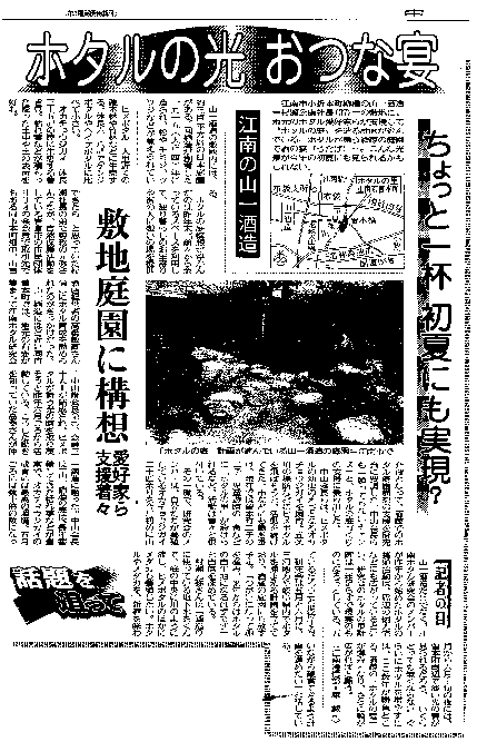 | 江南市小折本町柳橋の山一酒造=村瀬公康社長(37)=の敷地に、地元のホ夕ル愛好家らが支援して、”ホ夕ルの庭”を造る計画が進んでいる。ホ夕ルが舞う酒蔵の庭園で酒の宴(うたげ)―。こんな光景が今年の初夏にも見られるかもしれない。 山一酒造の敷地内には、約三百平方mの日本庭園がある。同酒造が創業した一九一五(大正四)年に造られ、松やモミジ、ツツジなどが植えられている。 ホ夕ルの庭構想が浮かんだのは昨年末。「前々から余っているスぺースを利用して、独り暮らしのお年寄りや街の人に憩いの場を提供できたら」と思っていた村瀬社長の弟で専務の元弥さん(三六)が、自然保護活動をしている岩倉市の市民団体リリオの会会員で取引先でもある同市本町畑中、山吉酒店経営者の高桑敏直さん(四一)にホ夕ル育成を勧められたのがきっかけだった。 山一酒造にほど近い同市曽本町では、地一元の有志が集まって江南ホ夕ル研究会ー中山修会長(七一)、会員二十人ーが結成され、ヒメボ夕ルが舞う光の園を取り戻そうと昨年六月ごろから活動している。こうした動きを知っていた高桑さんが仲介役となって、酒蔵でのホ夕ル庭園構想の支援を研究会に要請した。中山会長らも「願ってもないチャンス」と、ホ夕ルの庭づくりの支援に乗り出した。 中山会長らは、ヒメボ夕ルの幼虫のえさとなるオカチョウジガイを飼育。五条川の堤防などにヒメボ夕ルを飛ばそうと、活動を続けてきた。市などにも働き掛け、現在では曽本町二子の二子山児童遊園の一角などに「ホ夕ルの里」が設けられるなど、活動は着々と根付いている。 その一環で、研究会のメンバーは、自分たちが養殖しているオカチョウジガイ二十匹余りを今月初めに山一酒造に贈った。中山会長は「山一酒造の庭は、長年蓄積してきた枯れ葉などが豊富で、オカチョウジガイの成育には最高の環境。五月ごろには数十倍の数になっているだろう」と期待する。 研究会は五月と六月に、三河地方や岐阜県内でホ夕ルを捕まえる計画を立てており、酒蔵の庭園にも放す予定。「つがいになって卵を産み、来年からはホ夕ルの自生地になるはずです」と自信を深めている。 村瀬一元弥さんは「酒造りに使っている地下水をくんで、庭の中央に川のように流し、ヒメボ夕ルのほかにメダカも養殖したい。ホタルやメダカを、新酒を味わいながら観賞できるよう計画を進めたい」と話している。 ヒメボ夕ル 人里近くの雑木林や竹林などに生恵する。体長六ー八ミリでゲンジボ夕ルやへイケボ夕ルに比べて小さい。 オ力チョウジガイ 体長三−五ミリの陸に生息する巻き貝。枯れ葉などが積もった湿った土中や土の表面を好む。 記者の目 山一酒造だけでなく、江南ホ夕ル研究会のメンバーが昨年から始めたホ夕ルの養殖活動は、周辺の個人宅などにも広がっているといい、研究会のホ夕ルの里計画は一年足らずで現実のものになろうとしている。五月から六月上旬の夜には、曽本町周辺で淡い光の舞が見られるだろう。「いくらとっても無くならない」ぐらいにホ夕ルを増やすには、ここ数年が勝負どころ。酒蔵の「ホ夕ルの庭」が弾みとなり、さらに輪が広がればと願う。 (江南通信部・原 誠司) |
