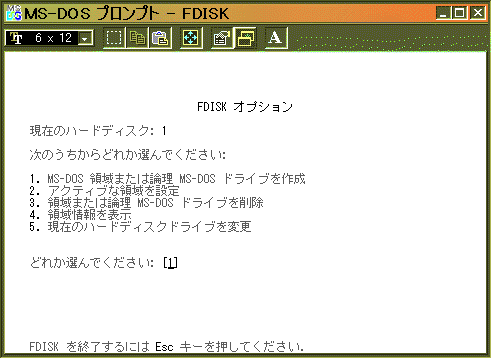 すべてが終わったら、<escap>で c:\> に戻って、また fdisk に入って、4番の「領域情報を表示」で確認して終わり。