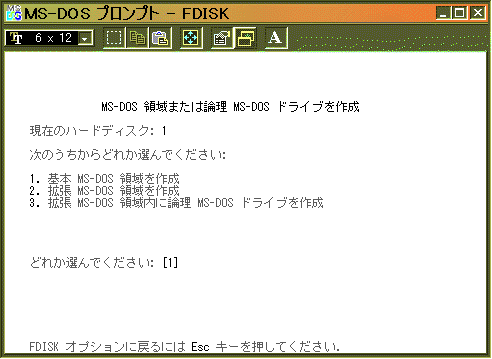 次の画面で、2番の「拡張MS-DOS領域を作成」を選びます。(図上)