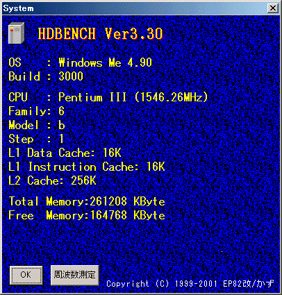 結局、この1.775V で 1.55GHz 設定にし、小一時間かかるWinbench99 の All Winmarks も問題無く終了したので、これで確定としました。なお Super Pi 104万桁 は 1分50秒。以下はお約束の HDBENCH です。