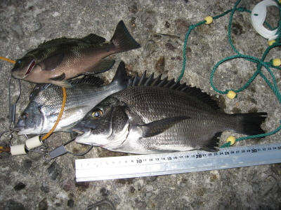 ●幸い周りのフカセ釣りの方へフグが気を取られているせいか、ハリスが傷まず好都合。エサ取りの活性はそこそこある。14時過ぎに24cmのカイズがきた。あと2尾、順調だ