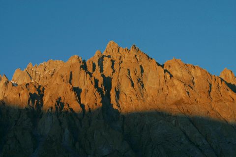 マチュルー村のシンボル、マッシャーブルム峰(7821m) 名もない無名峰が村を囲みます この山、頂上まで登るのに2日も掛かるそうです! 名前はないけれど、標高4000m級の裏山です 夕焼けに染まる村の裏山
