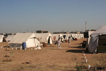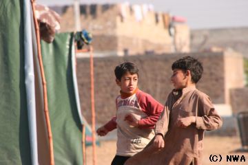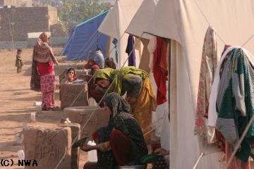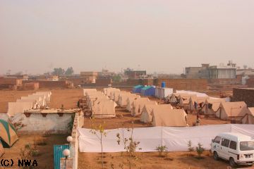 NWAでは、被災者を寒さから守り、栄養不良や不衛生な生活からの感染症から保護し、生活の再建を計るお手伝いができれば…と、イスラマバード郊外に被災民救済テント村をスタートさせました。