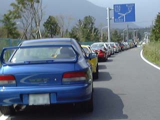 雑誌編集者のエボを合わせて152台の編隊移動なので