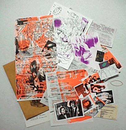 1991年11月7〜10日の4日間、NYの「The Ritz」で催された"ZAPPA'S UNIVERSE"コンサートの会場で売られていた、いわゆる『おみやげ袋』。 制作はカル・シェンケル氏で、限定ナンバー入りです。中身を見たい方はこちら。 16ページに及ぶ LYRIC BOOK、出演するプレーヤーのGUM CARD、ソングリスト、はたまた、カル氏のアートの断片の数々。ごちゃごちゃ入ってます。 コンサートの内容については、"ZAPPA'S UNIVERSE"の日本盤CD(POCP-1374)の解説の中で、湯浅 学氏が詳しく触れられていて楽しめます。 |